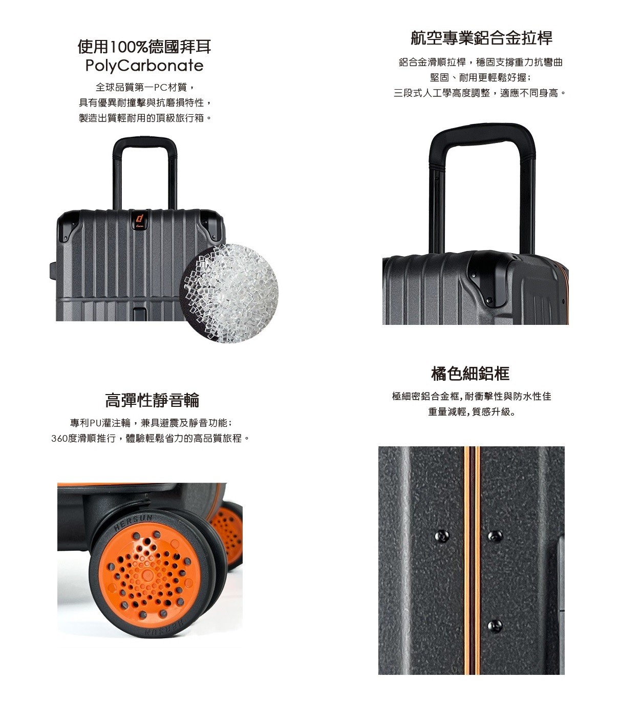 八輪穩定性高的輪子,並採用獨家專利HERSUN的PU灌注輪,推拉起來滑順省力且極靜音。