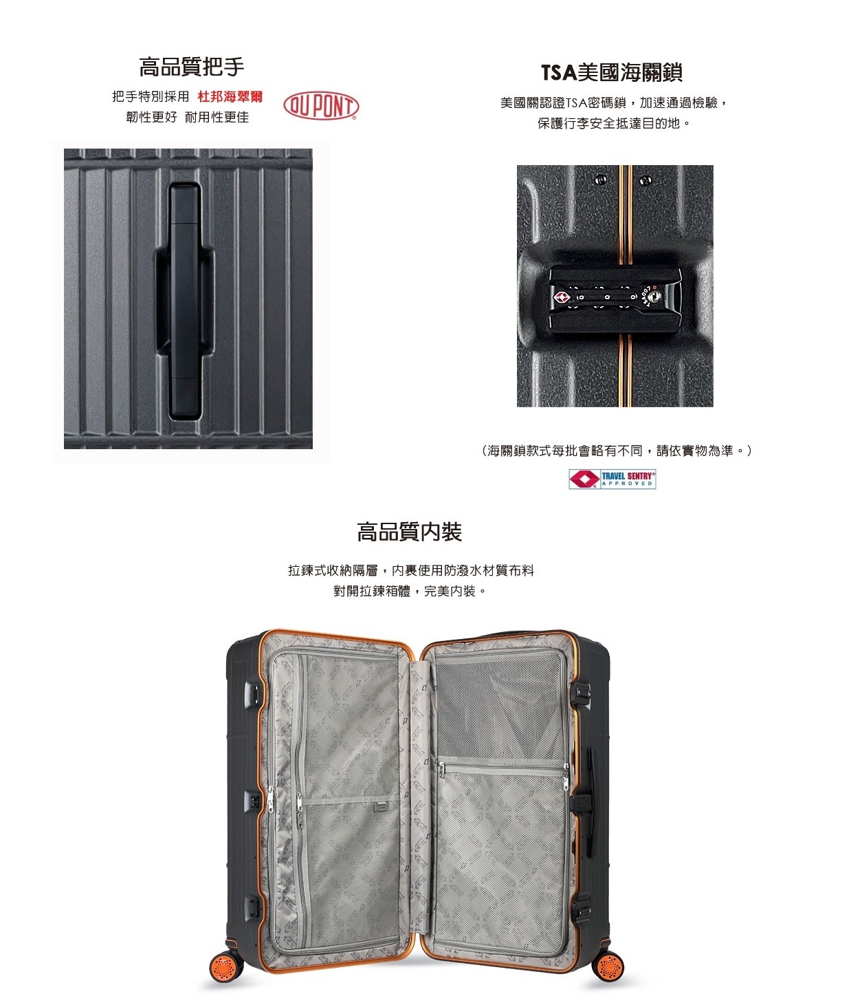 手提握把共三個,皆採用杜邦海翠爾,韌性更加更耐用.